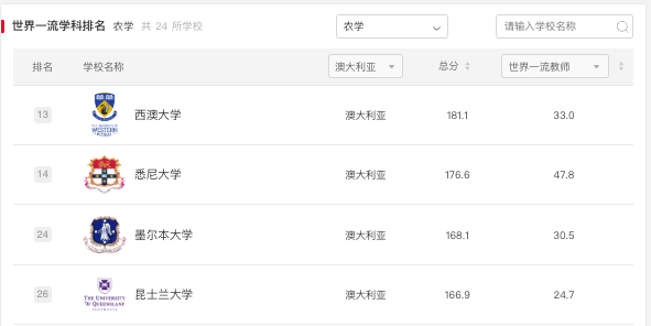 前三名:西澳大学(全球第13)、悉尼大学(全球第14)、墨尔本大学(全球第24)。