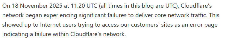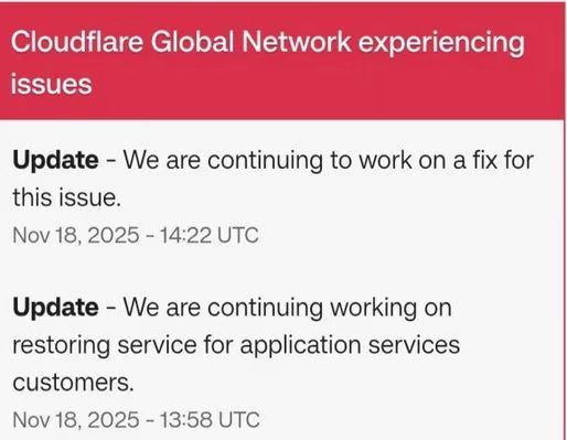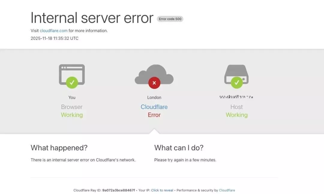 该公司在其官网上称,其全球网络于11月18日11:20 UTC(澳洲东部夏令时晚上22:20)前开始“出现故障”,引发大范围的500错误(Internal Server Error),并导致主要的网络平台瘫痪。
