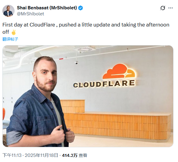 他发了条推文:在Cloudflare工作的第一天,推送了一个小更新,下午休息了。