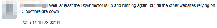 有人吐槽,至少DownDetector过了一段时间还能恢复,但别的依赖Cloudflare的网站全线瘫痪。