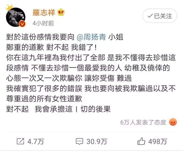他在第一时间回应态度模糊,隔天凌晨才正式道歉。一夜之间,他从炙手可热的流量艺人跌至谷底,至今仍背负这个标签。