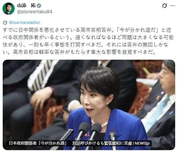日本参议员山添拓11月16日在社交媒体X上发帖,对高市涉台言论表示不满。他写道:“高市首相的答辩已导致日中关系恶化。有政府相关人士称,现在正处于十字路口。事态拖延越久,问题可能越严重,必须尽快打破僵局。要做到这一点,唯有撤回相关答辩。高市首相应当认清自己轻率答辩带来的重大影响。”