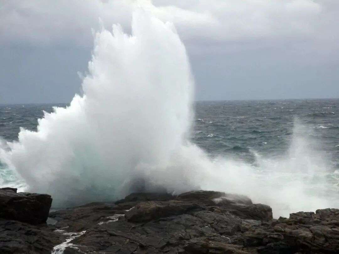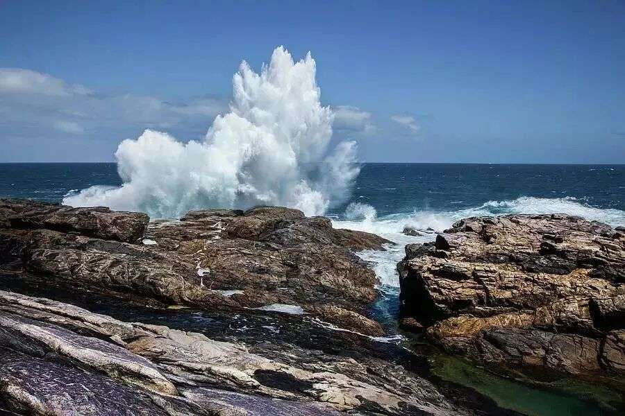 可不经意之间,一个高达数米的巨浪狠狠地拍打在岩石上。