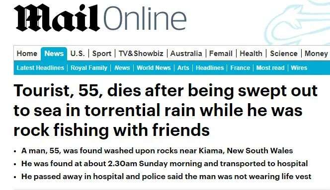 同一年的夏天,一名55岁的中国游客惨死在异国他乡,只因在澳洲海滩边的岩石上钓鱼,结果突然被大浪冲走,不幸溺亡。