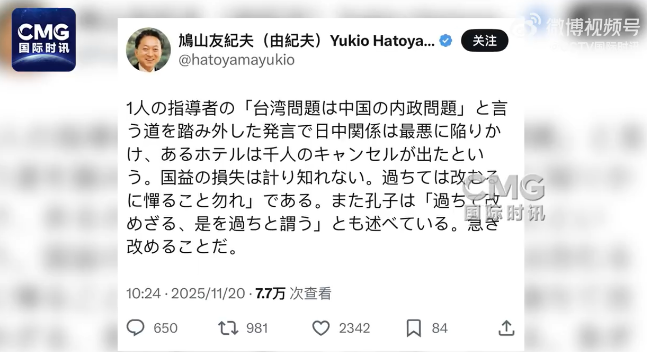 11月20日,据CCTV国际时讯消息,就近期日本首相高市早苗涉台的错误言论,日本前首相鸠山由纪夫当地时间11月20日再次发文: