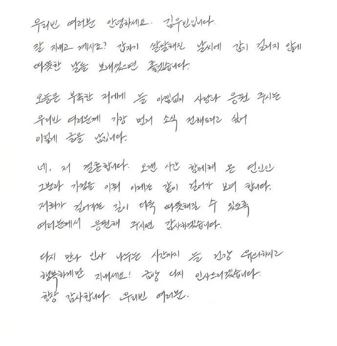 11月20日,据荆楚网,韩国男星金宇彬发手写信官宣与申敏儿结婚。信中写道:“对,我要结婚了,和长时间以来一起的那位恋人,准备组成家庭一直走下去了。”