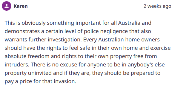 “这显然是一个关乎整个澳洲的重要事件,也暴露出警方存在一定程度的失职,这同样需要进一步调查。每位澳洲的房主都应享有在家中感到安全的权利,并能对自己的房产行使不受入侵者干扰的绝对自由与权利。任何人,未经邀请擅自进入他人财产都毫无借口可言,若真有此举,就该为这种侵犯行为付出代价。”