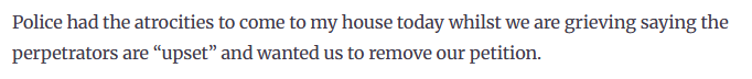 “然而今天,警察来到我们家要求我们撤回请愿书,声称这让犯罪人‘心烦’。”