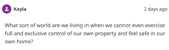 根据现行的法律,房主拥有“控制访问权、要求入侵者离开以及必要时使用合理手段将入侵者赶走的权利”。