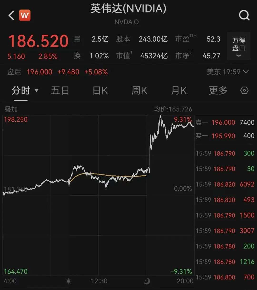 二级市场上,美股周三,英伟达涨2.85%,股价186.52美元/股,市值4.53万亿美元,依然稳居全球市值排行榜首位。财报发布后,英伟达盘后股价涨超5%。