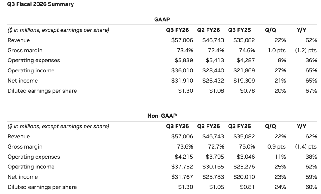 财报显示,英伟达第三财季营收为570.1亿美元,超出市场预期的549.2亿美元,同比增长62%;净利润为319.1亿美元,同比大涨65%,经调整后的每股收益为1.30 美元,高于市场预期的1.25美元。