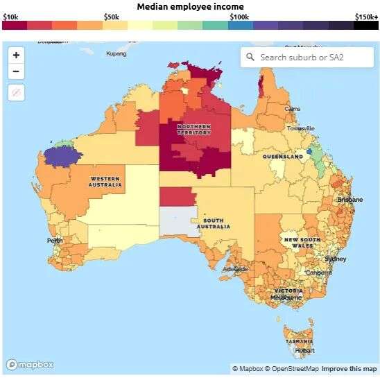 这张地图对比了澳大利亚各区域的员工收入中位数和平均值,揭示了地方层面的收入分布情况。