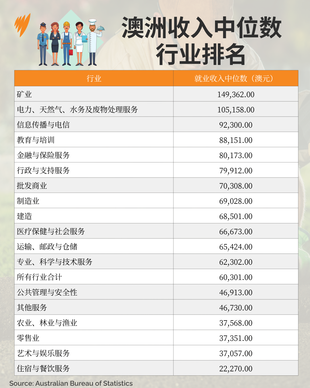 根据澳大利亚统计局(ABS)的最新数据,矿业从业者的就业收入中位数最高,而住宿和餐饮业从业者的收入中位数最低。