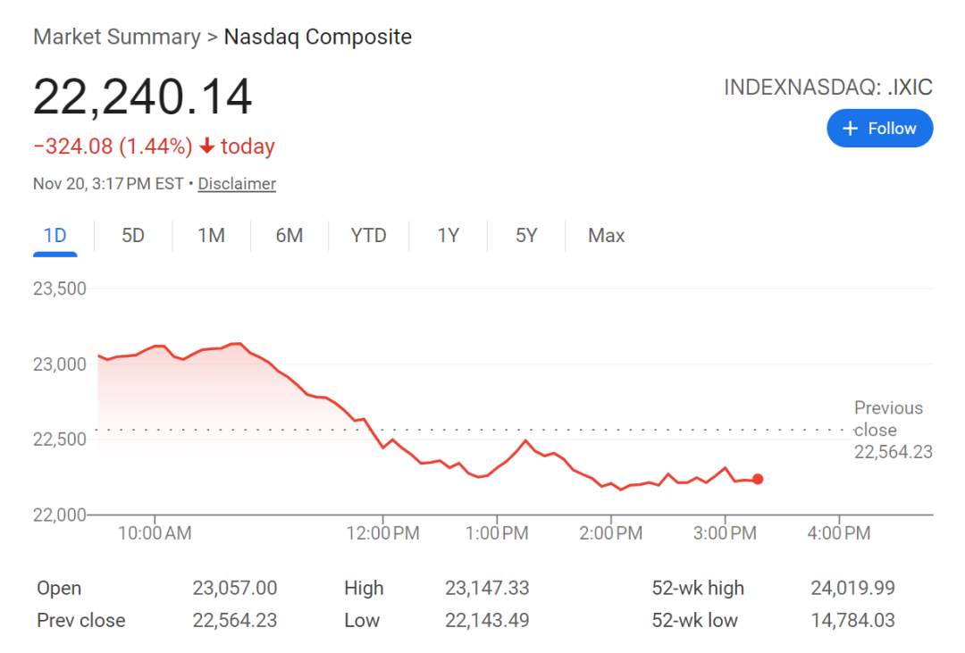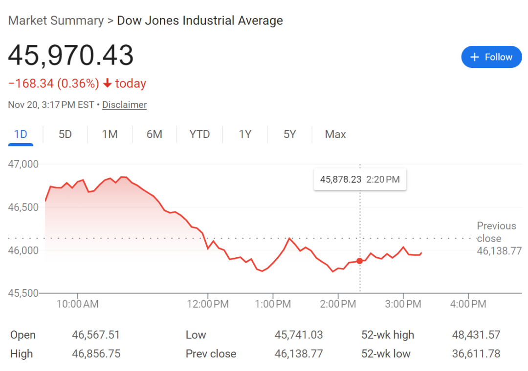 上午在沃尔玛和英伟达强劲财报,以及一份好于预期的就业报告带动下,市场一度全面上涨;但从美国东部时间 10 点 45 分左右开始,涨势突然逆转,三大指数快速跳水。