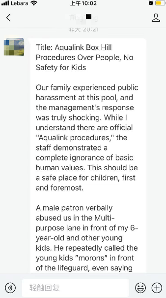 “我们一家在这家游泳馆遭遇了公共场合的辱骂,而管理层的处理方式更令人震惊。尽管我理解“Aqualink流程”的存在,但工作人员表现出对基本人性价值观的彻底漠视。