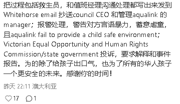 把过程包括救生员,和值班经理沟通处理都写出来发到Whitehorse email 抄送council CEO 和管理aqualink 的manager;报警处理,警告对方言语暴力,蓄意虐童,且aqualink fail to provide a child safe environment;Victorian Equal Opportunity and Human Rights Commission/state government 投诉,要求解释和事件报告。为的除了给孩子出口气,也为了所有的华人孩子一个更安全的未来。感谢你的时间!