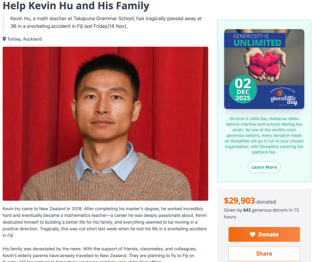 昨天,在新西兰捐助网站givealittle,有“胡老师的朋友和同事”创建了捐助网页。