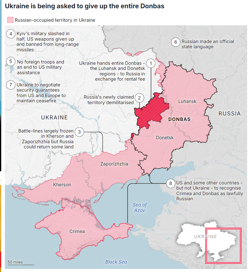 根据消息人士透露,美国要求乌克兰接受领土让步,让俄罗斯不仅保留现有占领区,也能获得更多由乌克兰控制的土地;解除西方对俄罗斯的制裁,并让莫斯科重新进入G8;同时要求乌克兰在一百天内举行大选,并削减军队规模。