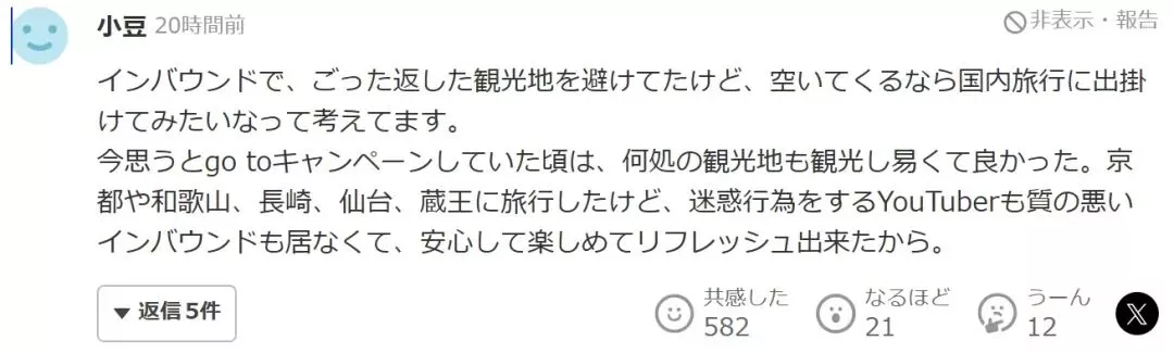 最“冷淡”的一句,直接说出了不少日本人的真实感受:“这不也挺好的吗?想取消的就取消,不想来的就不来。即便有自粛,也总有人选择来,也有人选择不来。年末期间对观光地和酒店可能会有影响,但目前景点的外国游客实在太多,甚至影响到市民的日常生活,所以游客减少可能会稍微好一些。也许年末那些高额的酒店价格也能稍微便宜一点吧。”