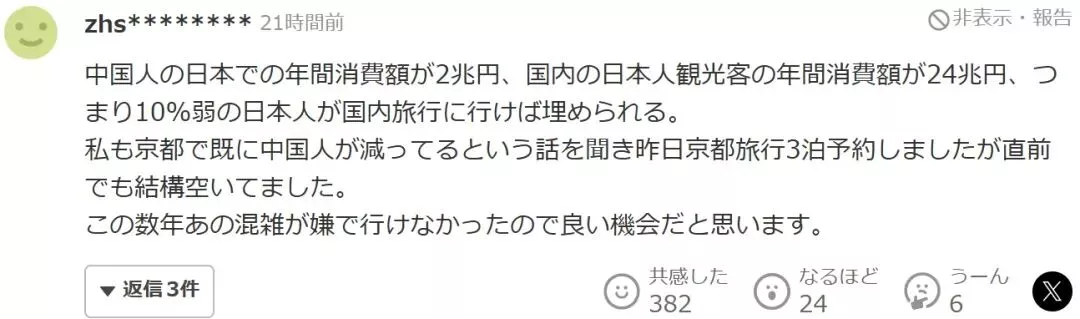 还有网友开始拿数字算账:“中国人在日本的年消费额约为2兆日元,而日本国内游客的年消费额约为24兆日元,也就是说,只要不到10%的日本人去国内旅行,就能弥补这部分缺口。我也听说京都的中国游客已经减少,所以昨天预订了京都三晚的旅行,临近出发的时候仍然有不少空房。这几年因为拥挤而不敢去,现在正好是一个好机会。”