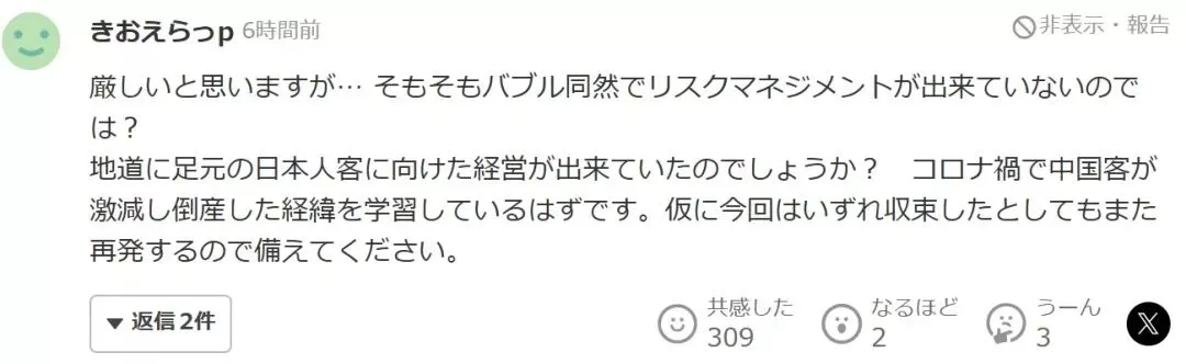 还有人提到口罩时期已经上过一课:“口罩期间中国游客骤减导致破产的情况,本来应该已经有所学习了。即便这次情况最终过去,也可能再次发生,所以请做好防备。”