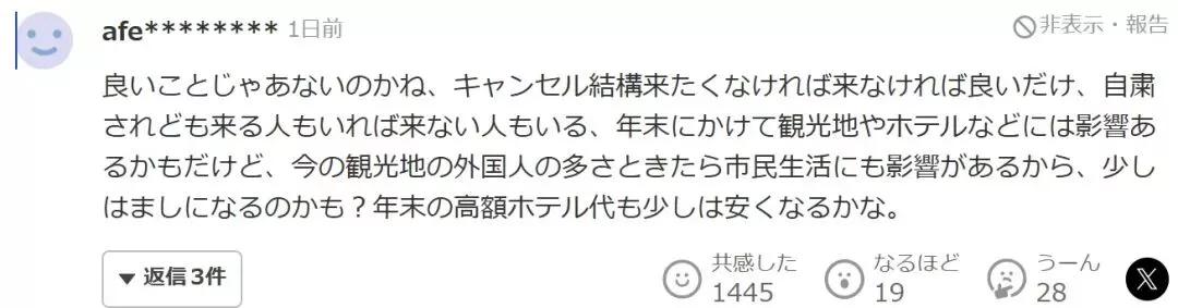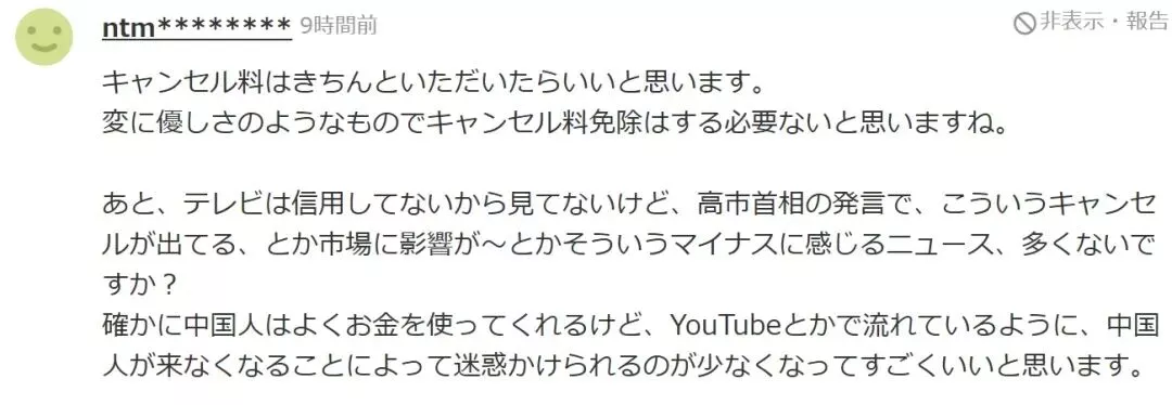 更有人对“免费取消”这件事一点都不同情:“我觉得取消费用还是应该好好收取。没必要因为所谓的“善意”而免除取消费用。另外,我不怎么看电视,所以没看过,但高市首相的发言引发的“出现了这种取消,对市场会有影响”等让人感觉负面的新闻,是不是挺多的?确实,中国游客消费很大,但就像在YouTube上看到的那样,中国游客减少反而让我们少受麻烦,我觉得这是非常好的事情。”