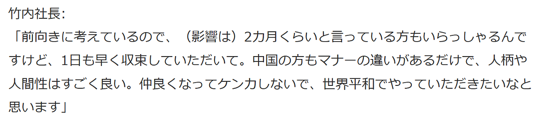 不过,竹内社长对中国游客的评价其实挺真诚,她强调,中国游客的礼仪和人品都非常好,希望这一波退订能尽快平息,旅游业早点恢复正常秩序。