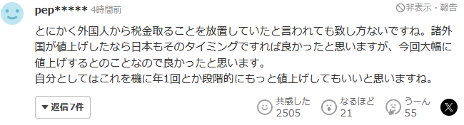 无论如何,即使被说是放任从外国人那里收税金,那也是没办法的事。外国涨价的时候,日本应该在那时涨价。但是这次据说会大幅涨价,我觉得也挺好的。