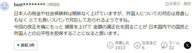我认为,以这次的修改为契机,提高频率并实现金额合理化,有助于保证日本国内公民和外国人的公平性。