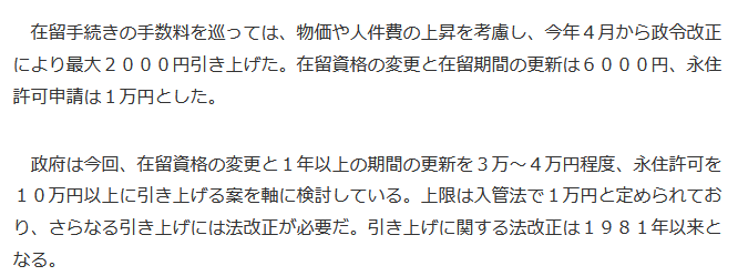 而且,申请永住许可的手续费也要增加。今年4月份,永住许可手续费从8000日元涨到了10000日元,涨幅2000日元。