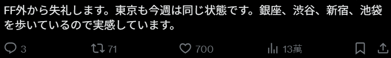 “打扰一下。这周东京的情况也差不多。我在银座、涩谷、新宿、池袋,亲身感受到了。”