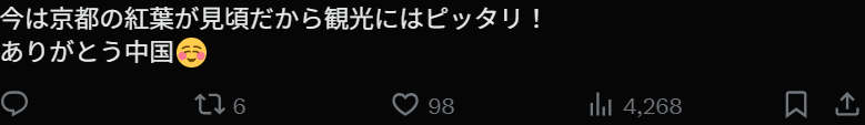 “现在正值京都红叶最佳观赏期,非常适合旅游!谢谢你,中国☺️”