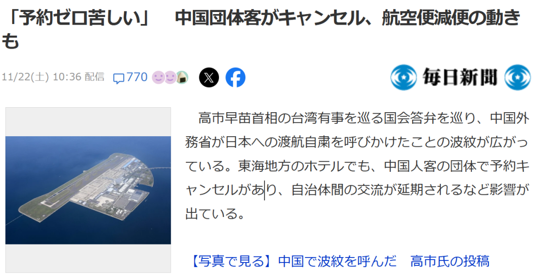 根据毎日新聞报道,三重县松阪市一家今年四月起开始正式接待中国团体游客的酒店,在11月20日以后连日出现预约取消,总计超过一百名团客。
