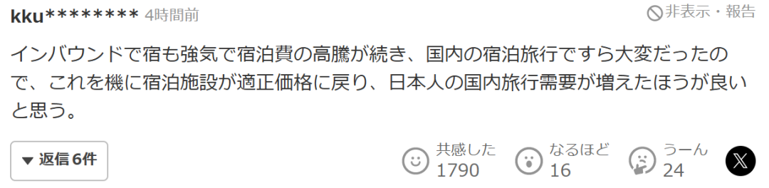 “因为入境游客的关系,酒店一直定价偏高,住宿费用持续上涨,连国内旅行也变得困难。我认为,正好可以借此机会让住宿设施回归合理价格,促进日本人国内旅行需求的增加,这才是好的发展方向。”