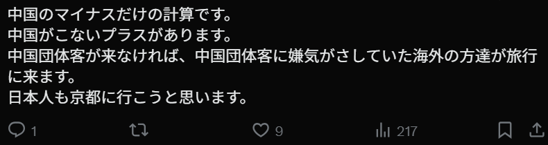 “这是只计算中国减少所带来的负面影响。但别忘了,中国游客不来也有正面作用。如果没有中国的团体游客,那些原本被中国团体弄得心烦的其他国家游客,反而会更愿意来日本旅行。日本人自己也会重新愿意去京都。”