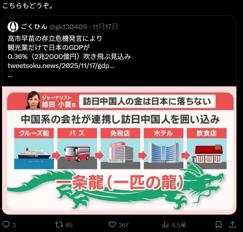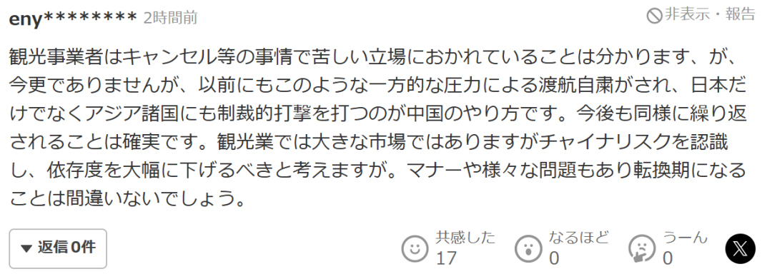 “我理解旅游业者因为取消等情况而处于困难境地,但这并非新鲜事,以前也曾出现过类似的情况:中国一方施加单方面压力,要求自觉减少出行,这种方式不仅影响日本,也会对亚洲其他国家造成制裁性打击。今后,这种情况很可能会继续重复发生。