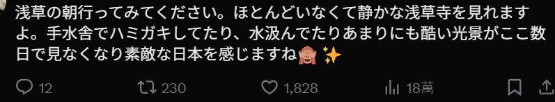 “去浅草的早晨看看吧。几乎看不到那些人了,可以看到安静的浅草寺。以前在手水舍刷牙、取水的那些过分行为,这几天几乎都不见了,能重新感受到美好的日本。”