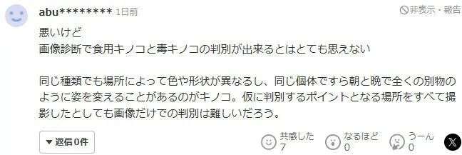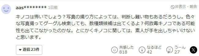 就此事件,和歌山市生活保健课强调:“通过AI或图鉴自行判断野菇是否可食,非常危险。对于无法百分之百确认为可食用菇的野生蘑菇,民众应该遵守‘不采、不吃、不买、不送’的四不原则。”