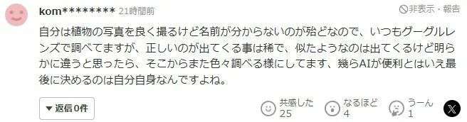 “我经常拍摄植物的照片,大多数时候不知道它们的名字,所以我总是用谷歌搜索,但很少能找到正确的名称。有时会找到类似的名称,但如果我认为它们明显不同,我会在此基础上进行更深入的研究。无论AI多么方便,最终的决定权仍然在我手中。”