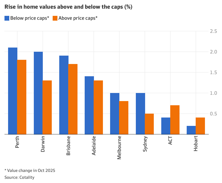 不同城市的价格上限包括:悉尼150万澳元、布里斯本和堪培拉100万、墨尔本95万、阿德莱德90万、珀斯85万、霍巴特70万、达尔文60万。