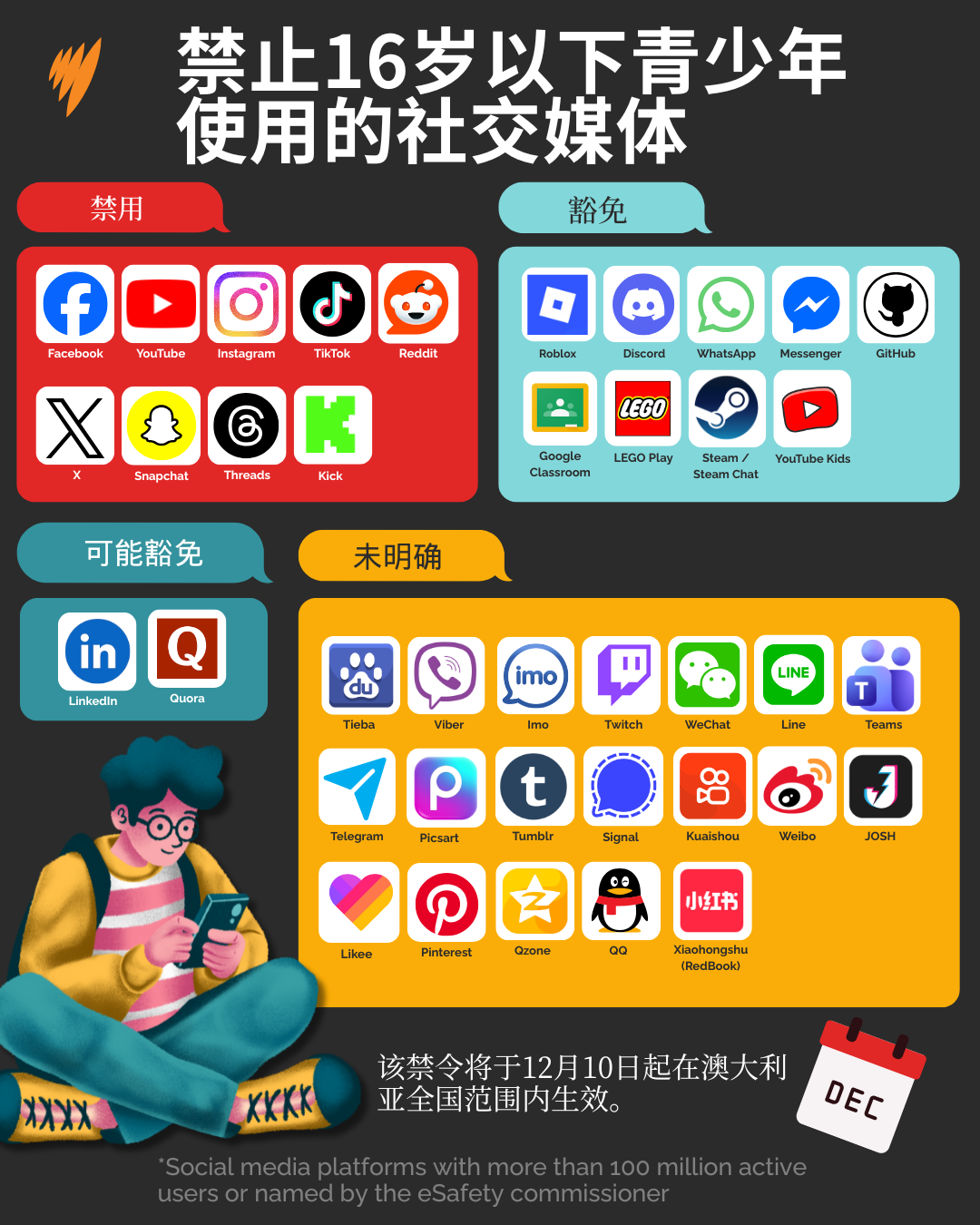 这项全球首创的 16 岁以下用户社交媒体禁令原定于 12 月 10 日生效。