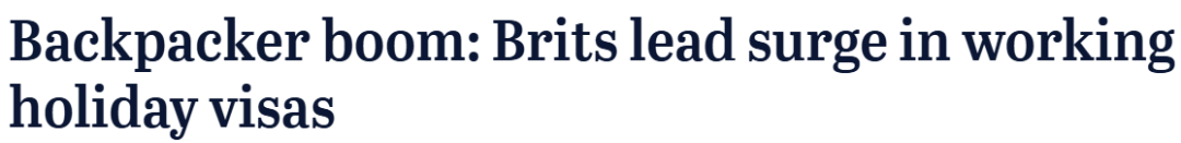 而在这一趋势中,英国年轻人占据主导地位,占所有背包客签证的四分之一,也就是说每四张打工度假签就有一张是发给英国年轻人。