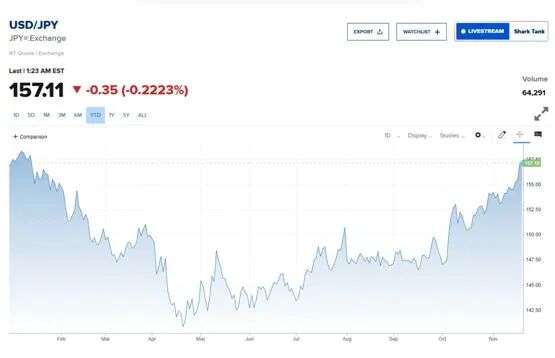 这一庞大的刺激计划此前已引发了市场对日本财政状况恶化的担忧,日元汇率与日本国债本月几乎同步大跌。尽管11月21日刺激计划正式公布后,美元兑日元小幅回落,短暂走低至157.20,但随后再度反弹,逼近可能触发日本央行干预的区间。自从9月以来,日元已在G10货币中领跌;日本10年期国债收益率本周早些时候也进一步跃升至了17年来的最高位。