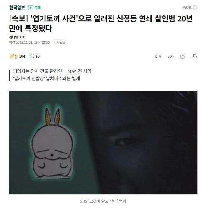 以“流氓兔杀人案”之名广为人知并被拍成韩剧《信号》的2005年首尔阳川区新亭洞连环杀人悬案,在案发20年后,终于确认了真凶身份。