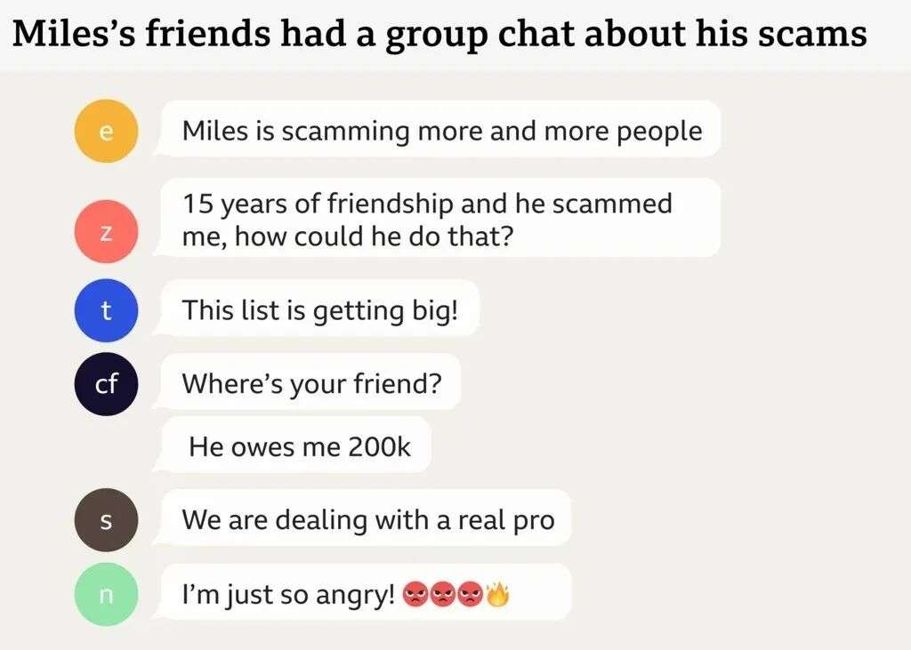2023年,迈尔斯再次行骗,向大约50人出售了音乐节的门票,最终带着钱跑路。这次这些人找到了迈尔斯的另一位老同学凯特,他们把凯特拉进一个群聊,里面都是迈尔斯的受害者。