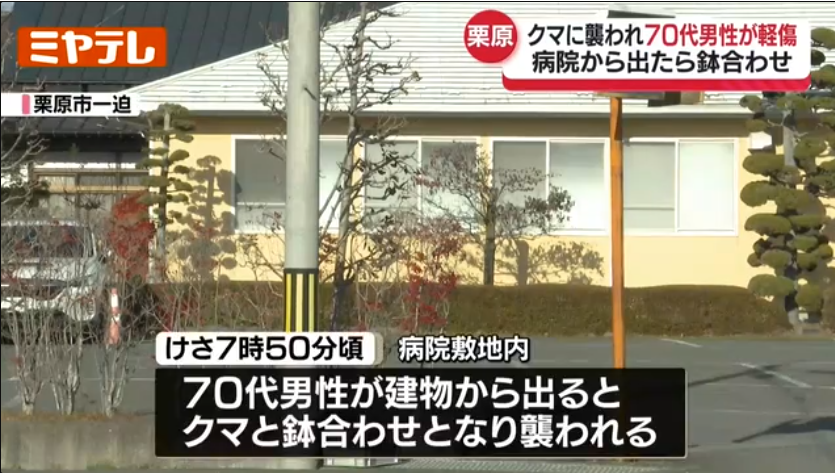 11月22日,宫城县栗原市一迫的一家医院院区内发生熊袭击事件。一名70多岁的男性刚从医院建筑物走出时,突然与一头熊正面相遇并遭到攻击。该男子面部和右臂受了轻伤,随后被送往医院治疗。