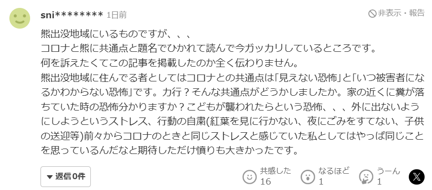 作为生活在熊出没地区的人来说......熊和新冠真正的共同点是“看不见的恐惧”和“随时可能成为受害者的恐惧”。你能理解在家附近发现熊粪时那种恐怖吗?你能体会到担心孩子被袭击的那种害怕吗?为了避免外出产生的压力、行为限制(不去看红叶、晚上不倒垃圾、接送孩子必须格外小心),这些早已让我觉得和新冠时期的压力完全一样。我原本还以为作者也是这样想的,所以才抱着期待读下去,没想到失望越大、愤怒也越深。