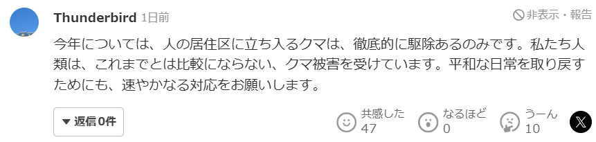 关于今年的情况,闯入人类居住区的熊只能被彻底清除。我们人类正遭受前所未有的熊害。为了尽快恢复和平的日常生活,恳请相关方面迅速采取行动。