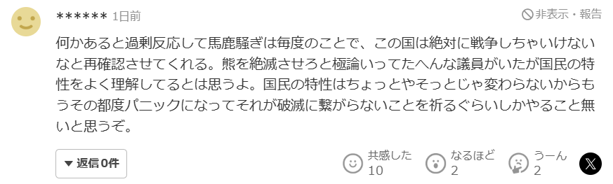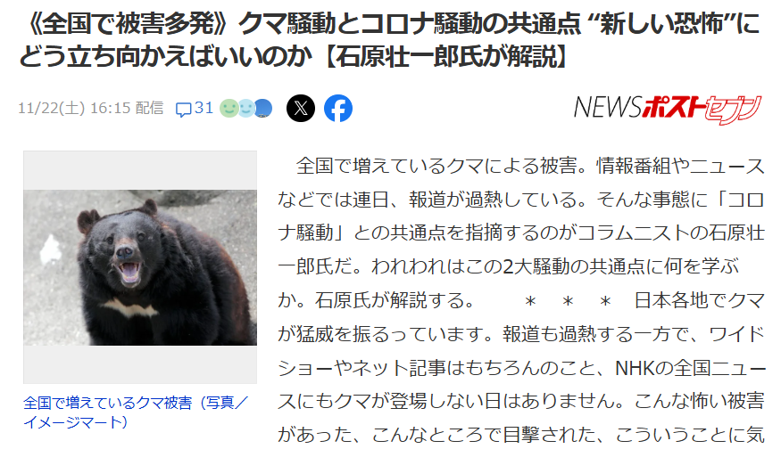 一遇到什么事就过度反应、吵吵闹闹,这已经是这个国家的常态了,也再次让我确认日本绝对不能打仗。之前有个奇怪的议员说要把熊灭绝,那家伙倒是很了解国民的特性。国民的特性不是轻易能改变的,所以每次发生这种事只能任由大家恐慌,然后祈祷这种恐慌不要导致走向毁灭,大概也只能做到这种程度吧。