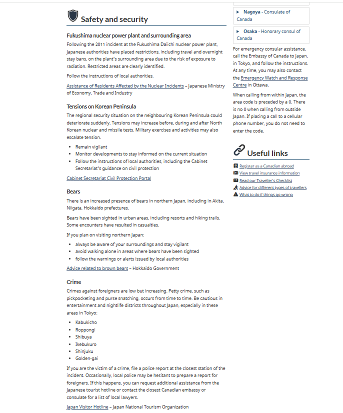 不仅美国,加拿大政府也向公民发布提醒。在海外旅行咨询网站上,日本部分地区的风险等级被调高,提示内容清晰写道,“日本近期多地发生熊袭击游客事件,请避免单独前往山区及偏僻区域。”